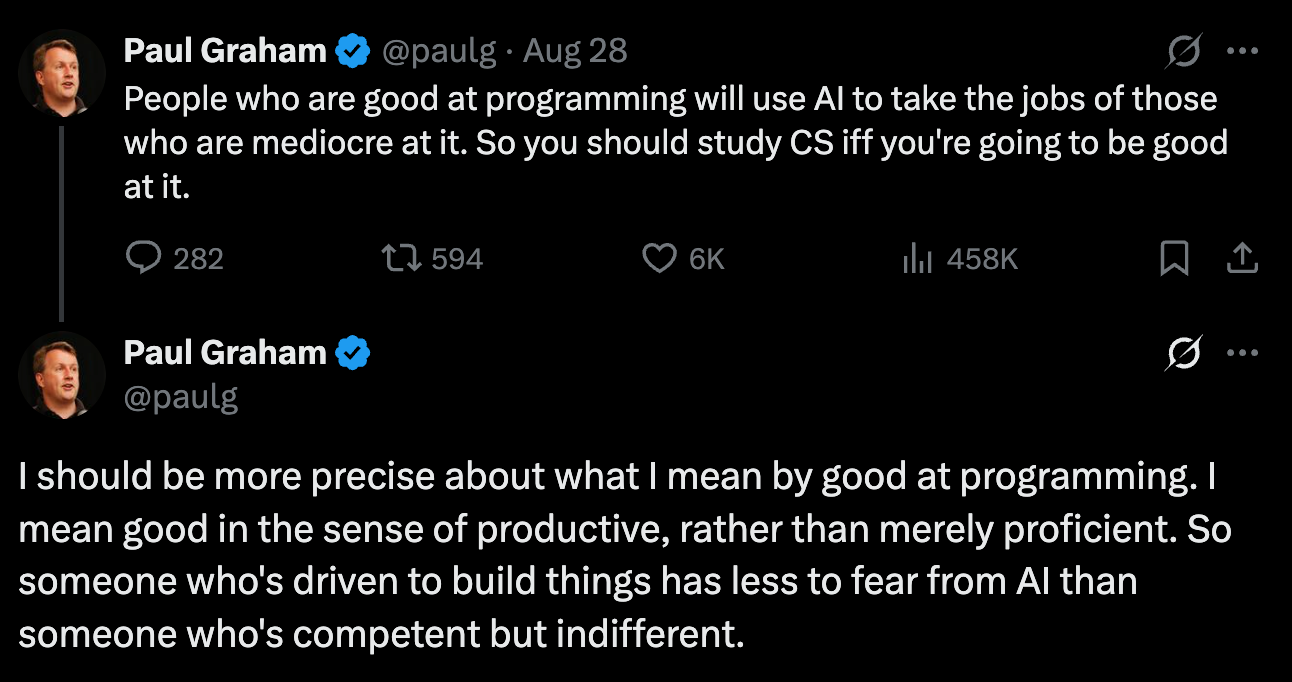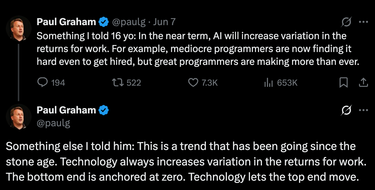 Paul Graham tem alertado constantemente para esse efeito. Na comparação acima feita no Twitter, ele prevê que programadores “medíocres” terão seus empregos absorvidos por bons programadores que não se importam de utilizar a Inteligência Artificial.